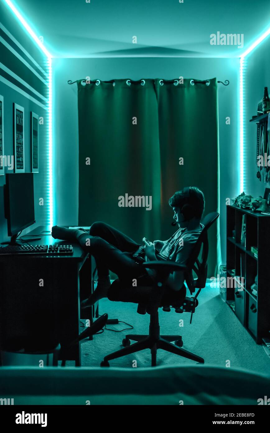 Teenage Boy Playing Video Game At Desk In Room With Neon Led Lighting Cavf93545 Cavan Images - Led lights are small lights typically organized in a flexible rope.